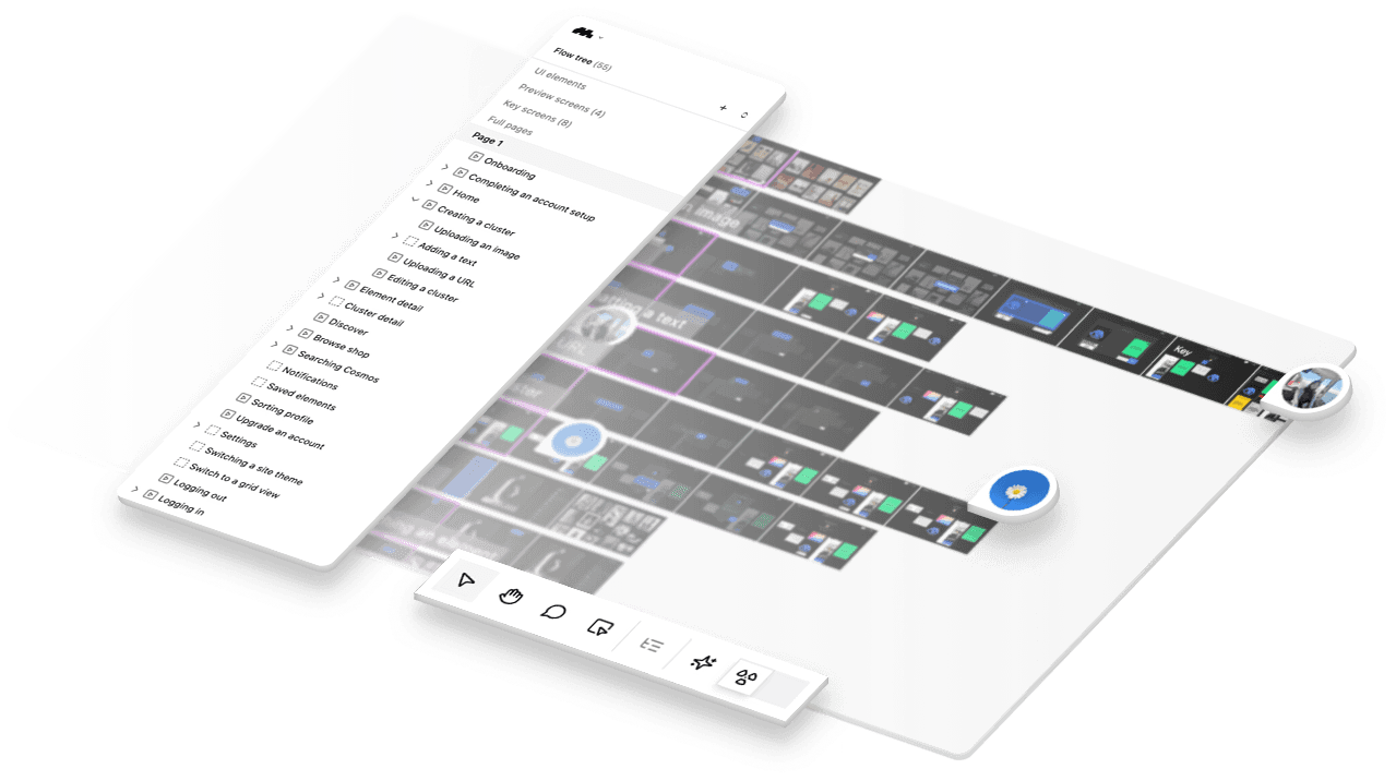 Simultaneous editing with instant updates powered by a custom sync engine. User presence including live cursors, viewport following, and cursor chat.