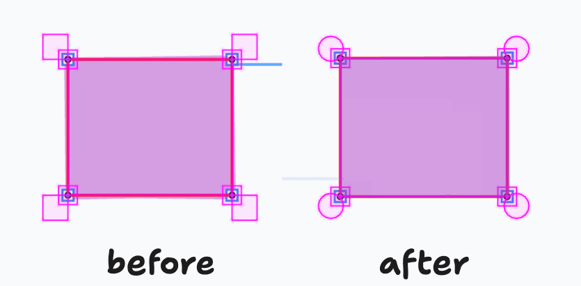 A new entrant to the design tools space, Pencil also uses the same size for both its corner and edge areas, with an offset square rotation area centered on the geometry corner and clipped from the internal space of the geometry. Similar to Sketch but without the slightly more narrow edges.