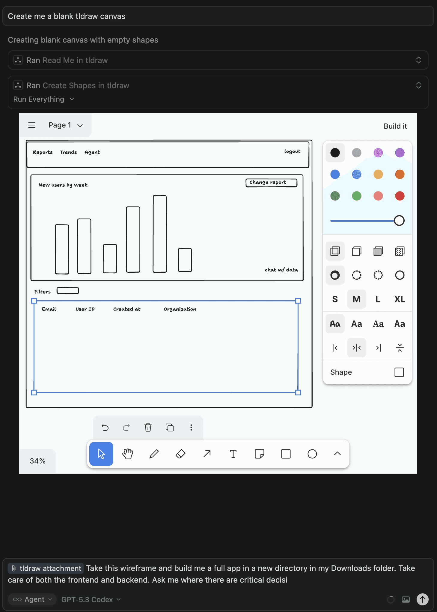 The app gives your agents access to three main tools: one to create shapes, one to edit shapes, and one to delete shapes. While editing, your agent can interact with the canvas in the same way that you could as a user. We pass the current state of the canvas back into the chat context so your agent will understand changes as they happen.