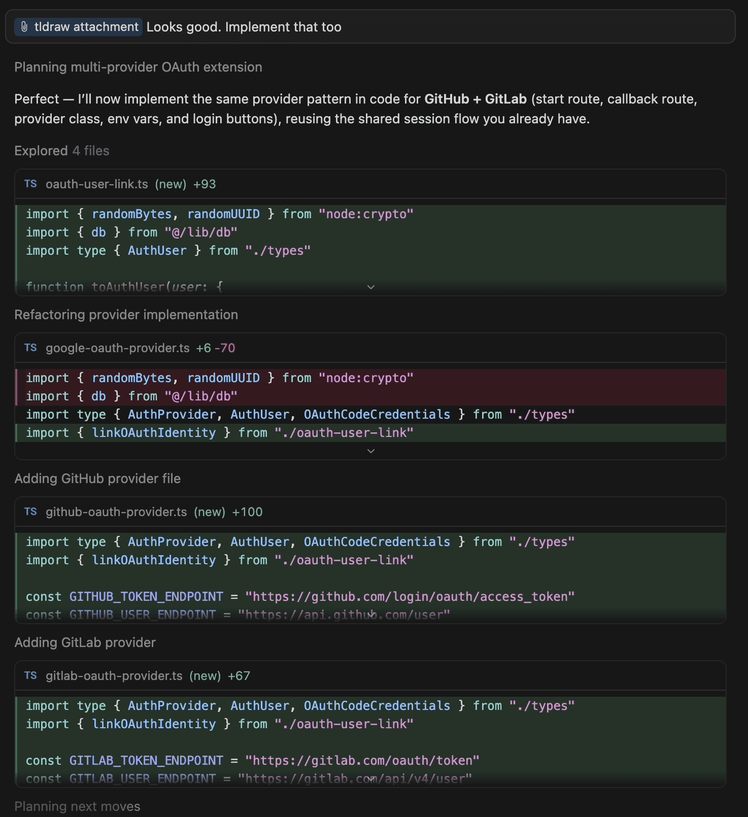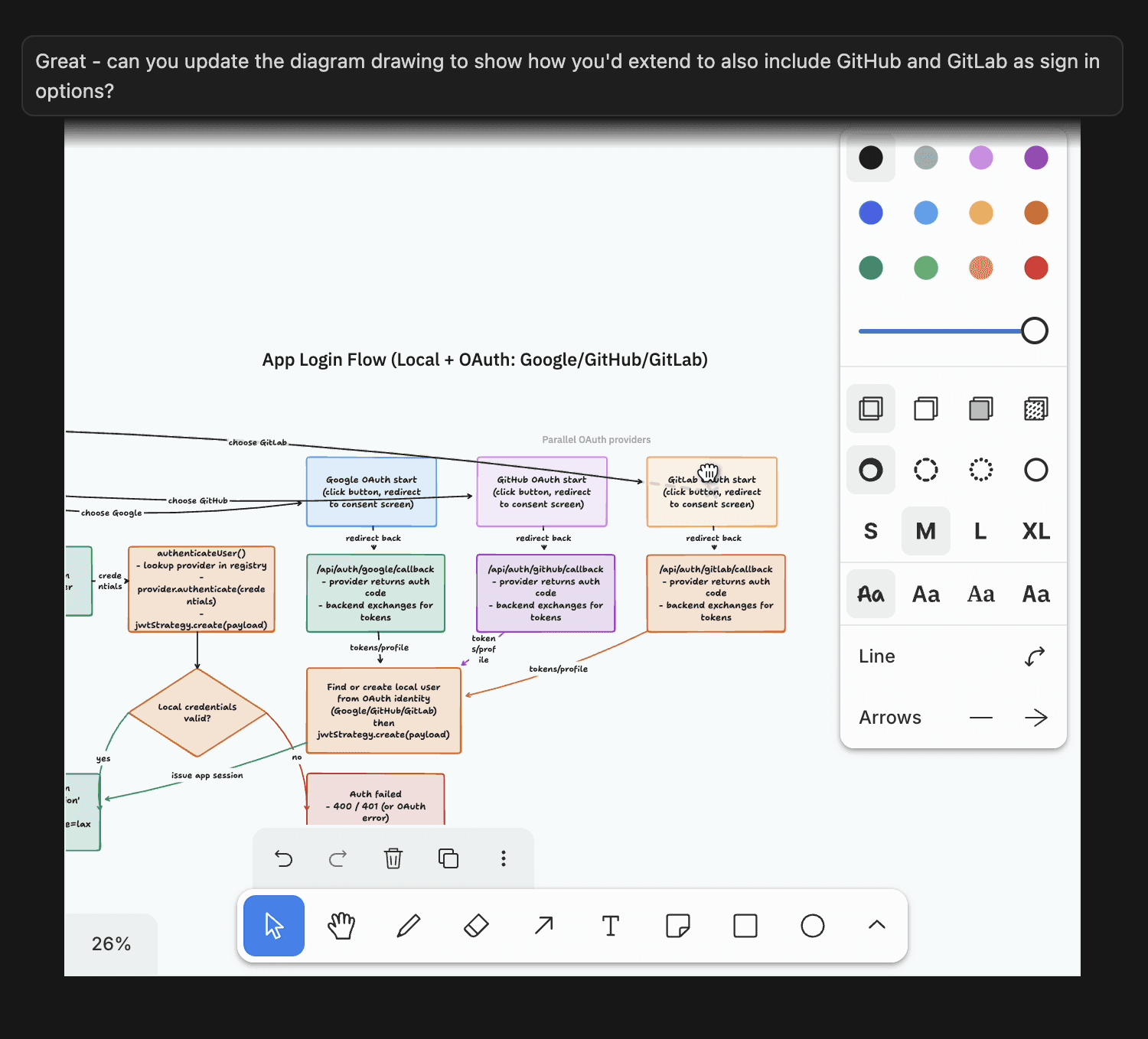 Update the diagram to include social sign-on through Google and GitHub, then ask Cursor to revise its plan.