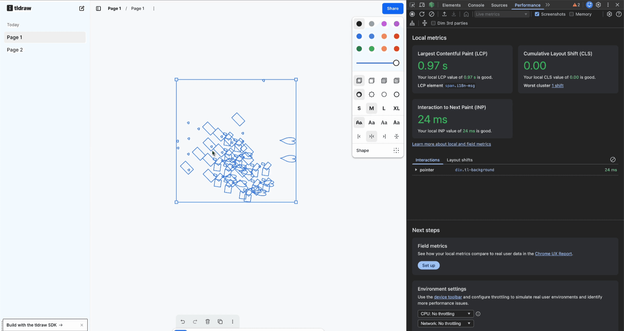 We’ve just landed a new release of the tldraw SDK. This version improves performance across the board (thanks Claude), adds a new starter kit and improves our agent kit, adds a new quick zoom function, redesigns our laser pointer, and surfaces two secret fill styles.