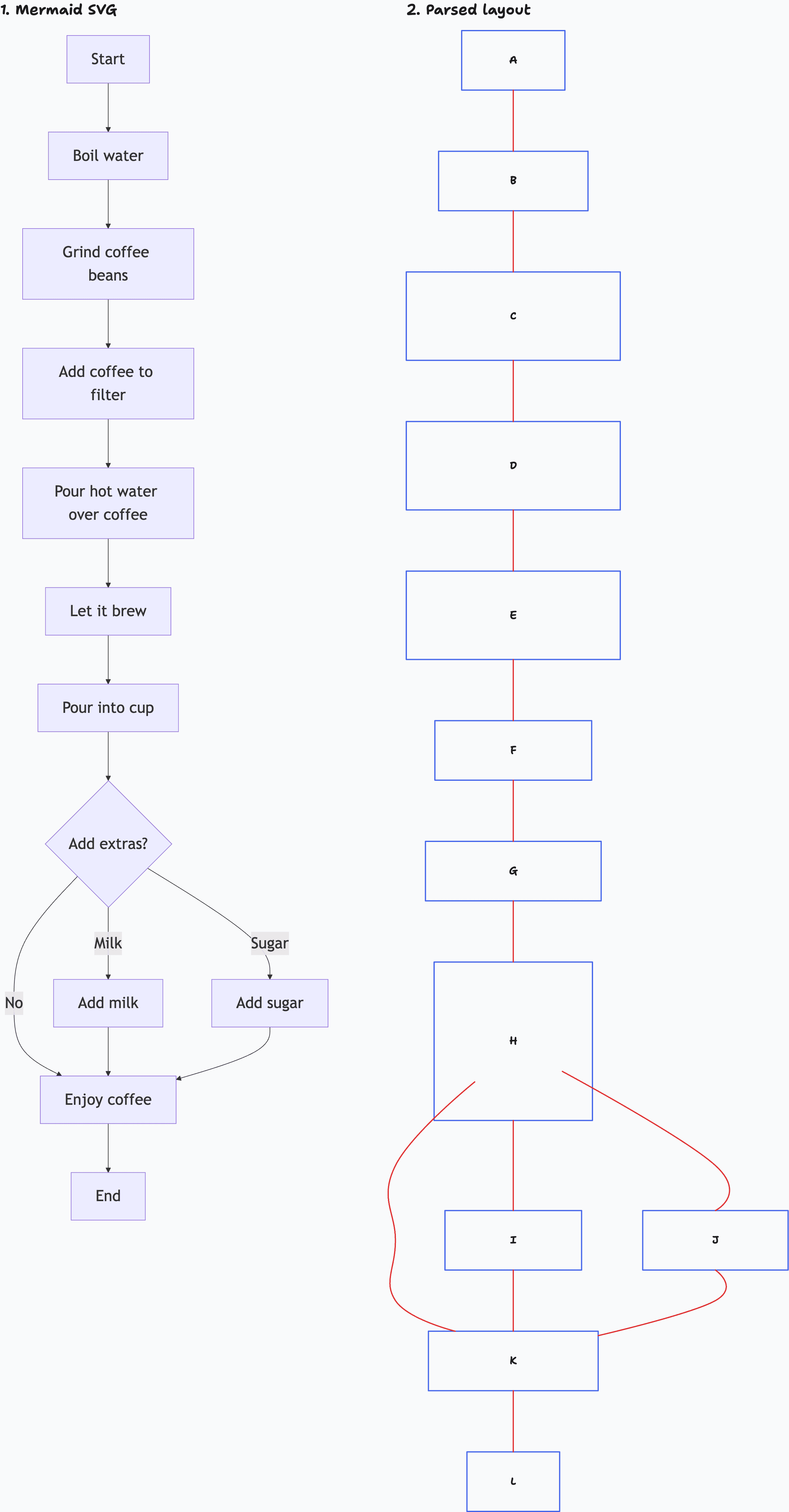You can get the “what” (which nodes exist, how they connect) from the parser and then get the “how” (what the diagram actually looks like) from the SVG. But to take the code and render it as tldraw shapes we needed both of these pieces of the puzzle at once. So we took a multistep approach: parse the diagram to get the semantic data, render it offscreen to get the spatial data, then stitch them back together.